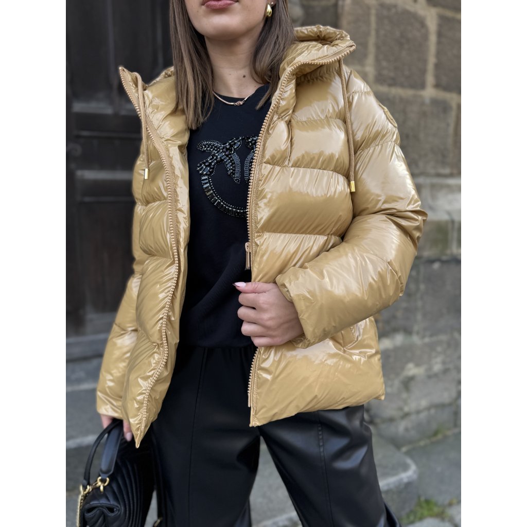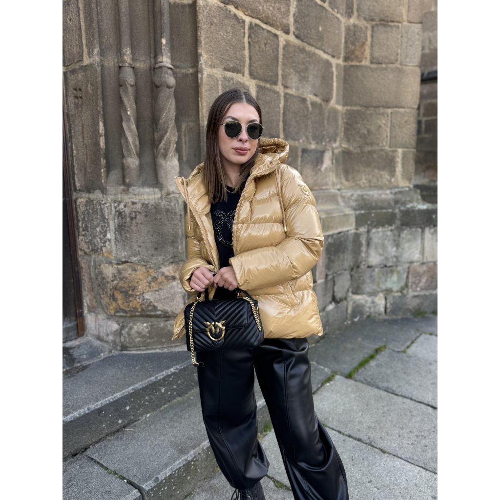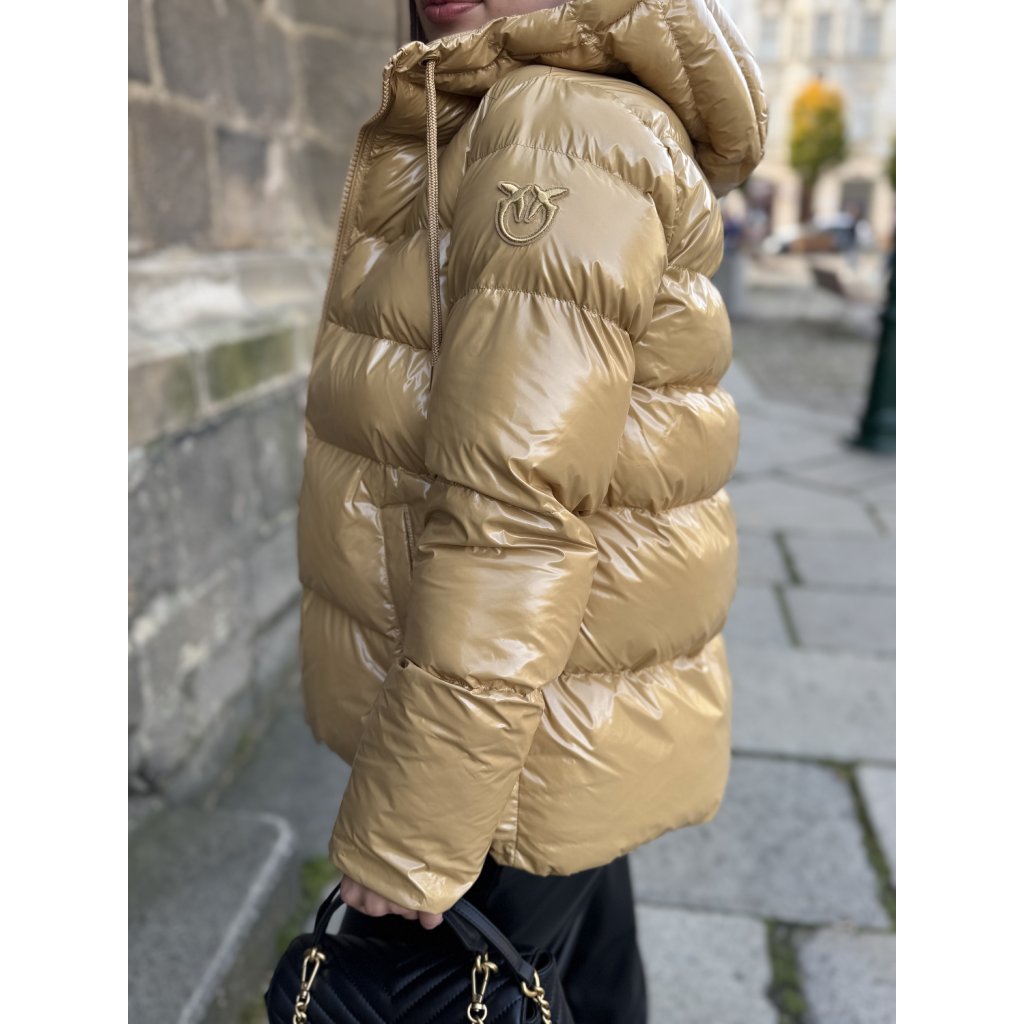 Lesklá karamelová bunda Pinko Eleodoro s kapucí a výplní z hřejivého syntetického peří. Stylový krátký střih, ikonické logo na rukávu a luxusní vzhled pro zimní sezónu.