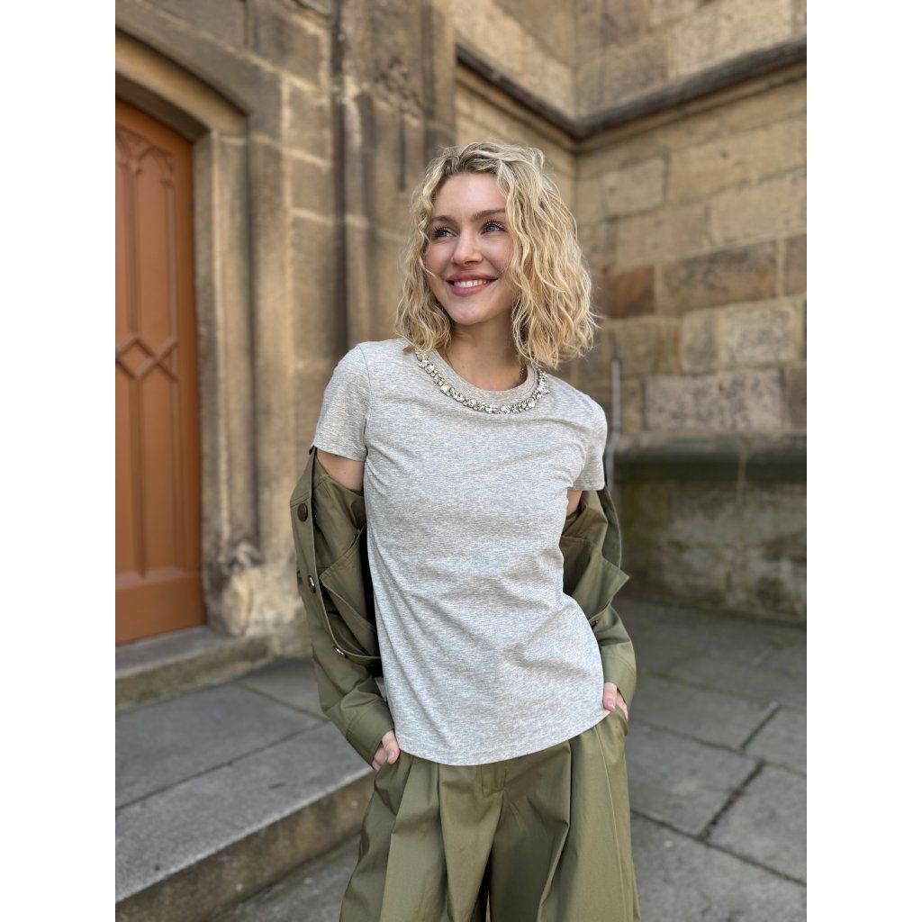 Dámské triko Twinset 261LL2BEE 12837 v šedé barvě. Elegantní basic kousek se zdobeným výstřihem.