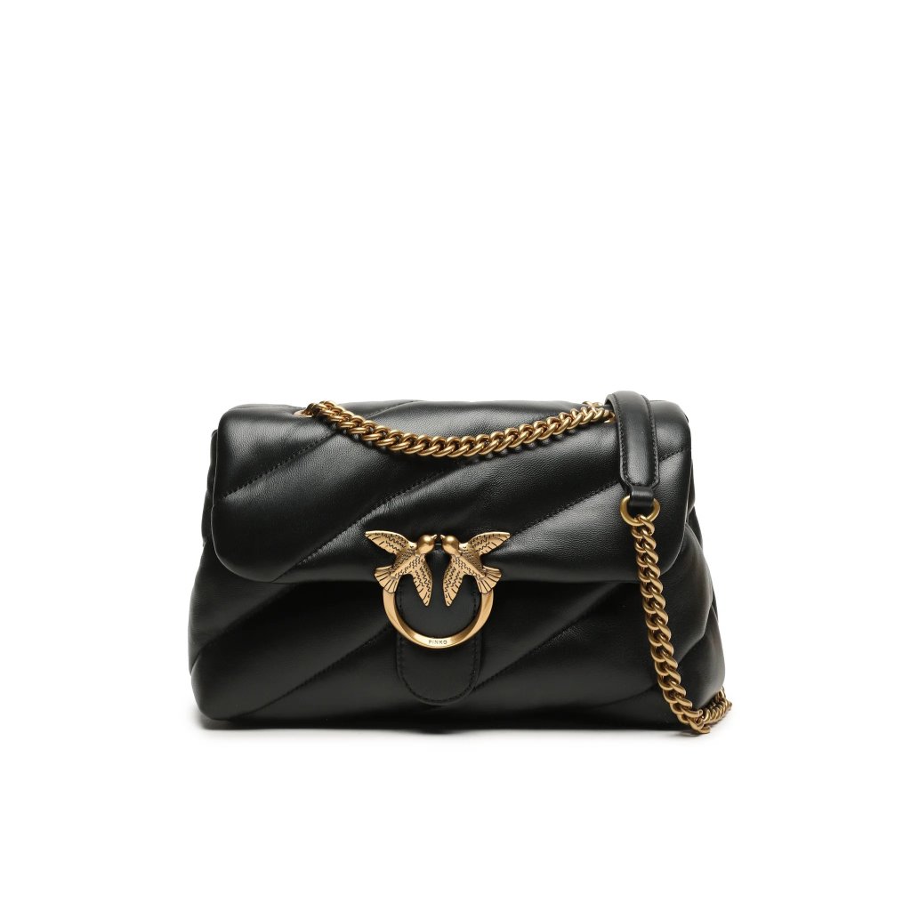 Kožená kabelka PINKO v černé barvě se zlatou sponou Love Birds.