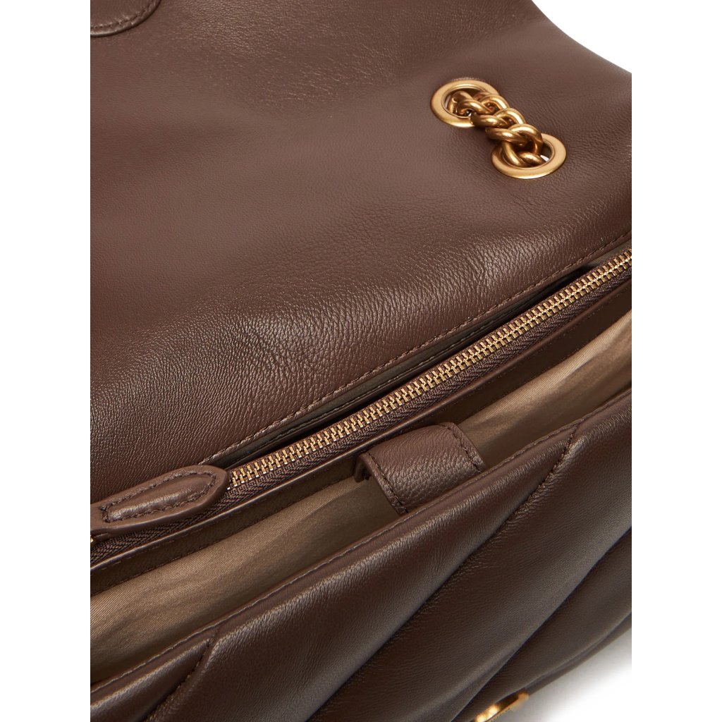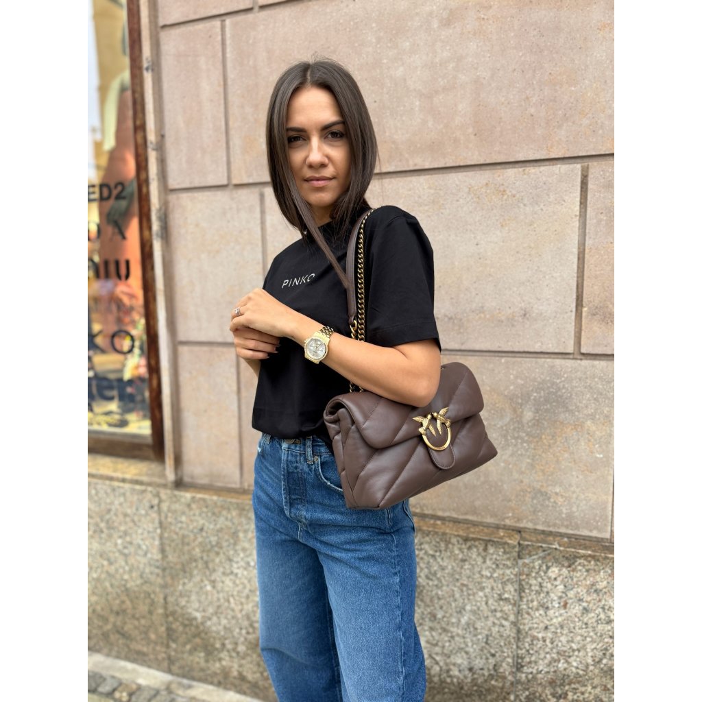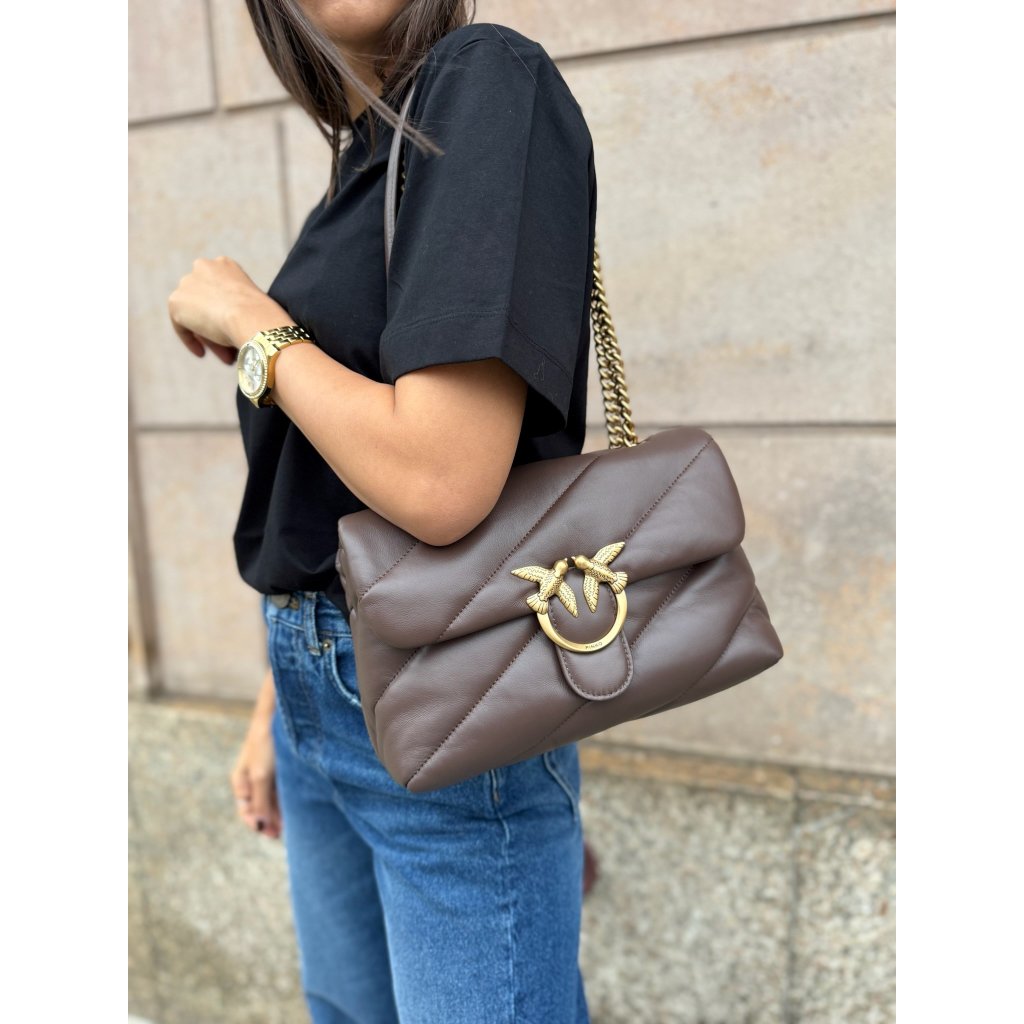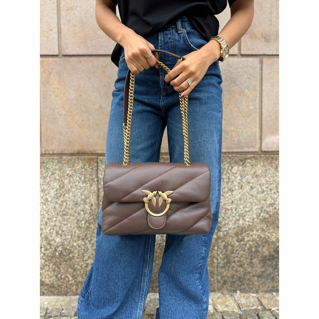 Elegantní kožená kabelka PINKO Love Classic Puff v hnědém odstínu je symbolem nadčasového stylu. Vyrobena z jemné, kvalitní kůže s prošívaným vzorem a zdobena ikonickou zlatou sponou se dvěma ptáčky Love Birds. Řetízkový popruh umožňuje nošení přes rameno i crossbody. Luxusní a praktický doplněk. Rozměry: 28 × 18 × 11 cm.