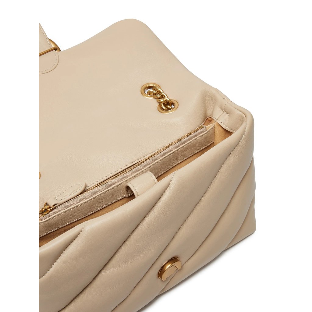 Béžová kožená kabelka PINKO Love Classic Puff je symbolem elegance a ženskosti. Vyrobena z jemné, vysoce kvalitní kůže s prošívaným vzorem a zdobena ikonickou zlatou sponou Love Birds. Řetízkový popruh umožňuje nošení na rameni i přes tělo. Ideální doplněk pro každodenní i společenské outfity. Rozměry: 28 × 18 × 11 cm.