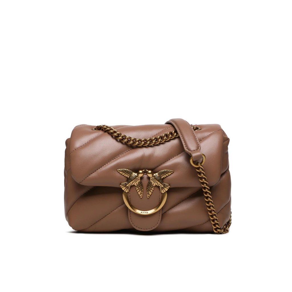 Kožená kabelka PINKO Love Mini Puff v béžovohnědém odstínu se zlatou sponou Love Birds.