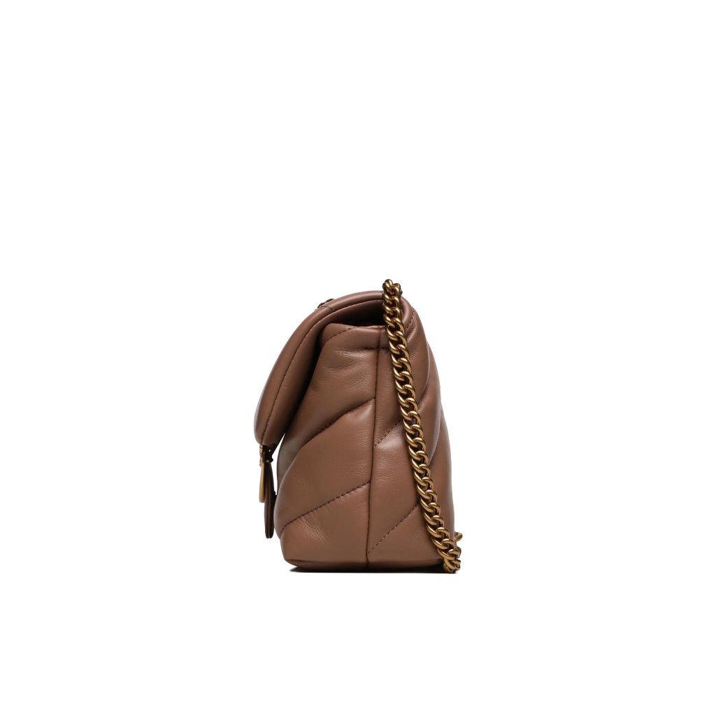 Kožená kabelka PINKO Love Mini Puff v elegantním béžovohnědém odstínu je ideálním doplňkem pro každodenní i večerní nošení. Vyrobena z jemné, vysoce kvalitní kůže s prošívaným vzorem a zdobená ikonickou zlatou sponou Love Birds. Kovový řetízkový popruh umožňuje nošení přes rameno i crossbody. Rozměry: 22,5 × 15,5 × 9 cm.