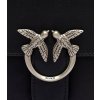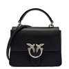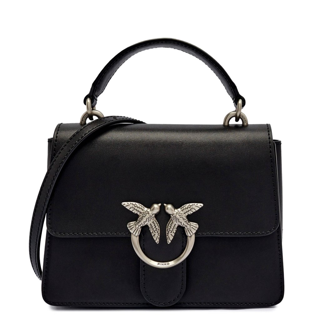 Elegantní černá kožená kabelka PINKO se stříbrnou sponou Love Birds a popruhem přes rameno.