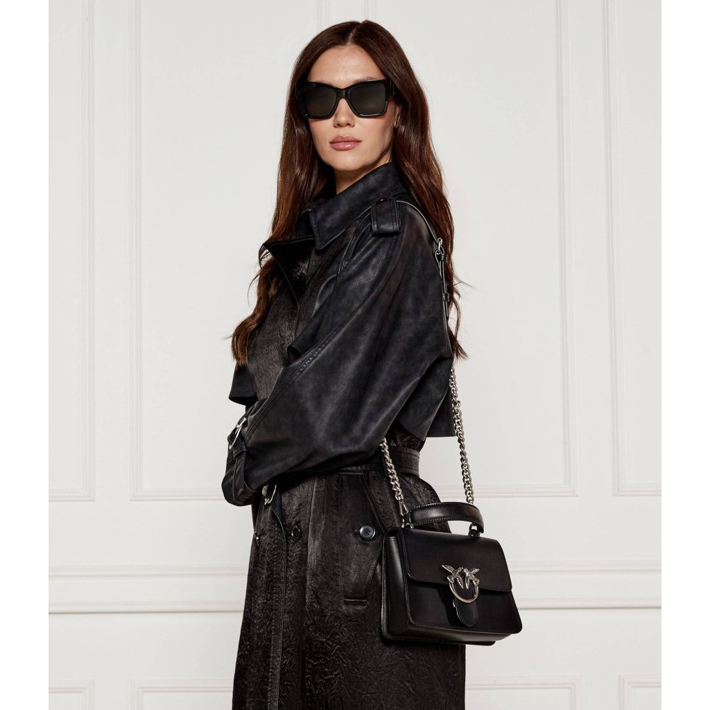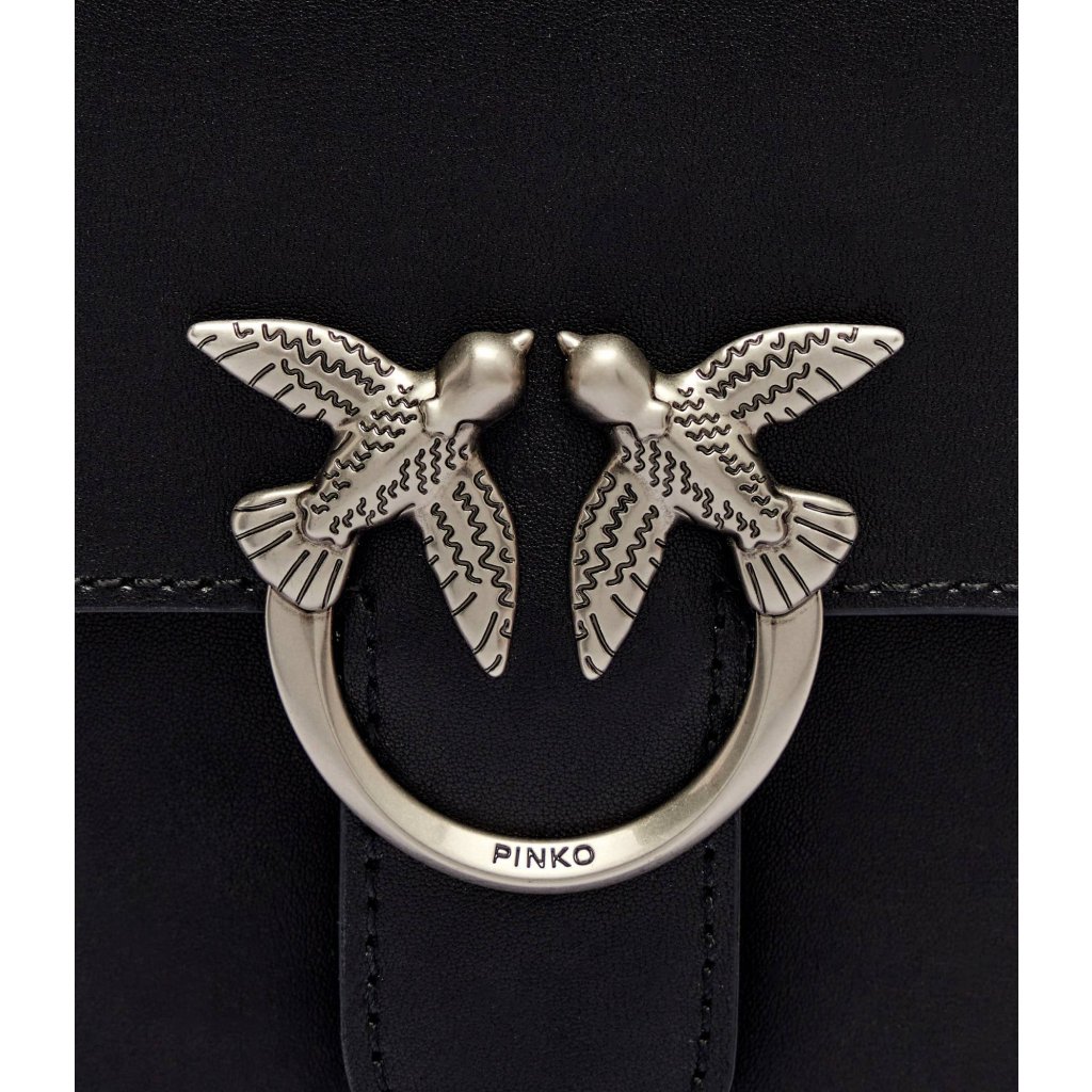 Elegantní černá kožená kabelka PINKO se stříbrnou sponou Love Birds a popruhem přes rameno.