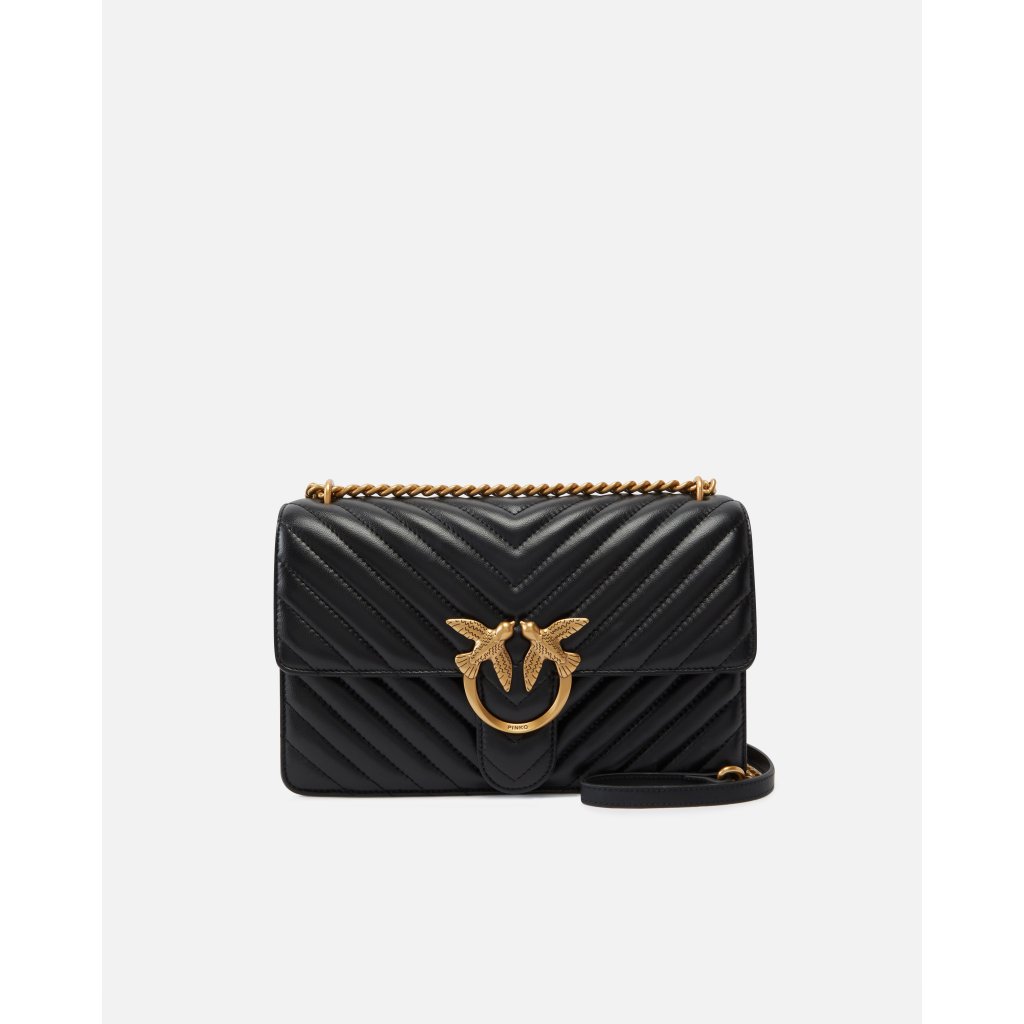 Stylová kabelka PINKO Love Bag One z černé napa kůže s prošíváním, zlatou ikonickou sponou Love Birds a řetízkovým popruhem.
