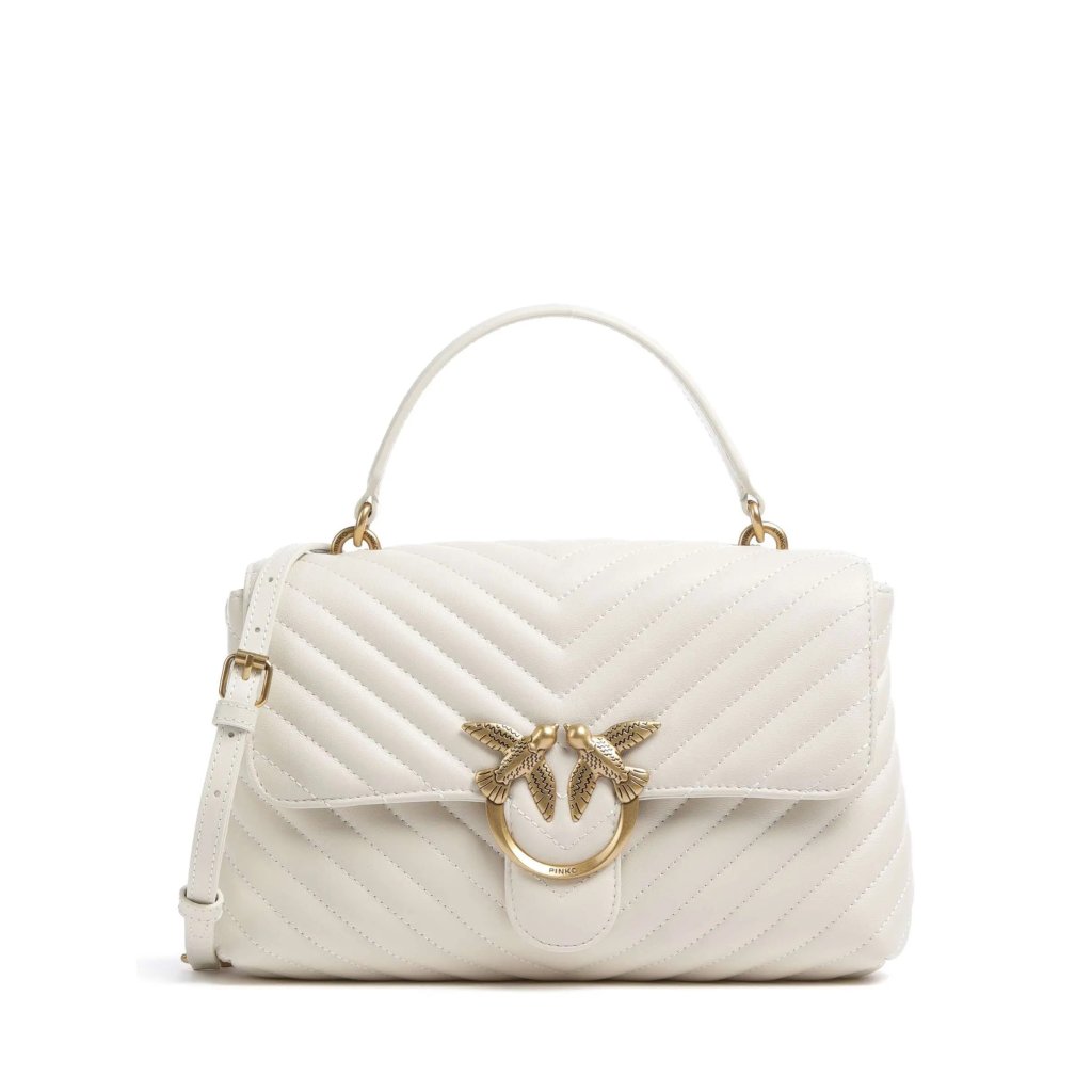 Elegantní kabelka PINKO Love One z prošívané kůže v jemném odstínu ivory dodá každému outfitu nádech luxusu. Ikonická kovová spona Love Birds podtrhuje ženskost a styl značky. Kabelka nabízí kvalitní zpracování, vnitřní kapsu a praktický ramenní popruh pro pohodlné nošení přes rameno či do ruky.
