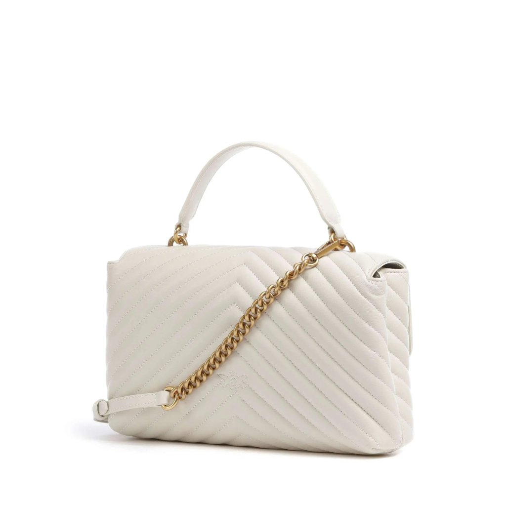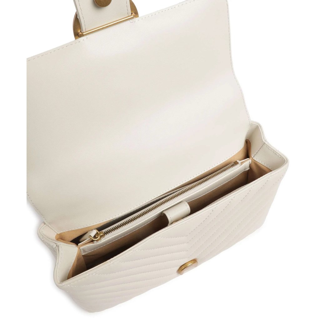 Elegantní kabelka PINKO Love One z prošívané kůže v jemném odstínu ivory dodá každému outfitu nádech luxusu. Ikonická kovová spona Love Birds podtrhuje ženskost a styl značky. Kabelka nabízí kvalitní zpracování, vnitřní kapsu a praktický ramenní popruh pro pohodlné nošení přes rameno či do ruky.