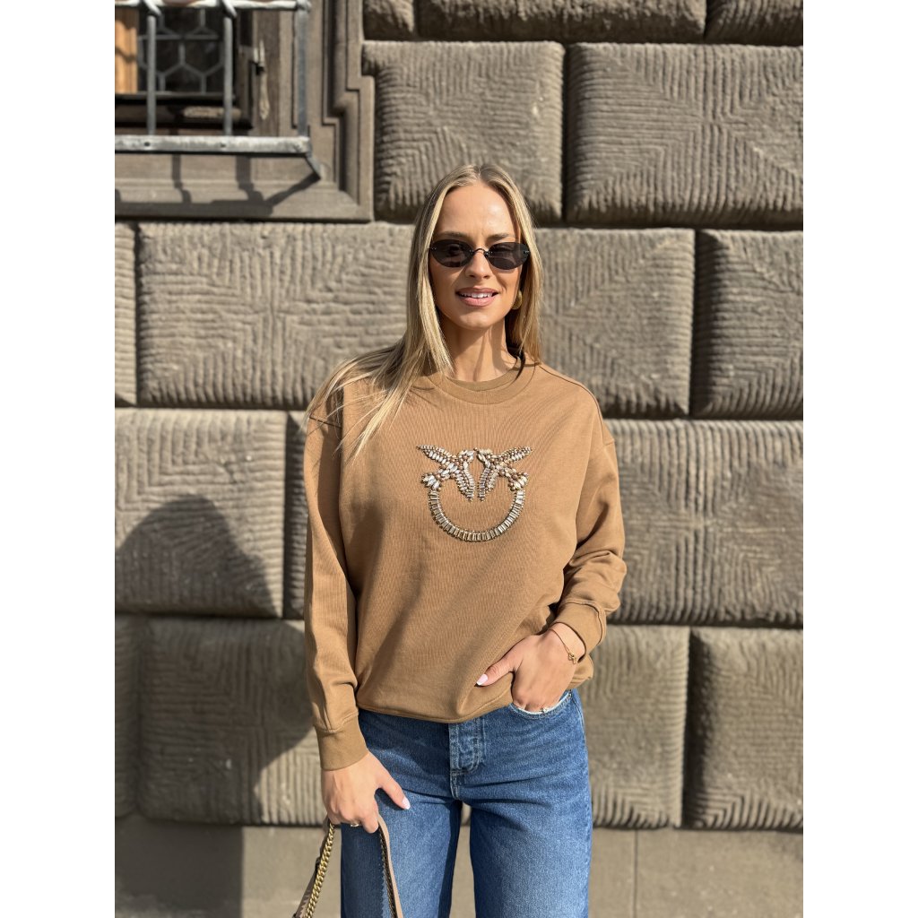 Hnědá mikina Pinko NELLY s kamínkovou aplikací, regular fit střih- a stylový základ pro moderní šatník.
