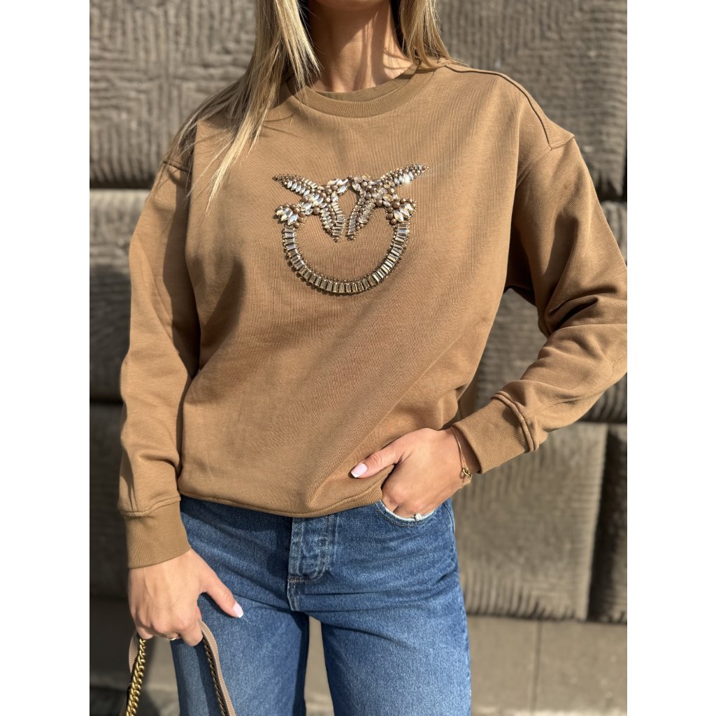 Hnědá mikina Pinko NELLY s kamínkovou aplikací, regular fit střih- a stylový základ pro moderní šatník.