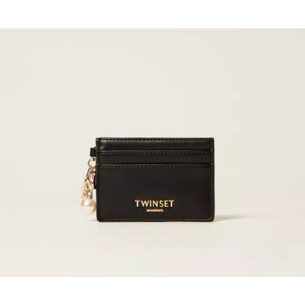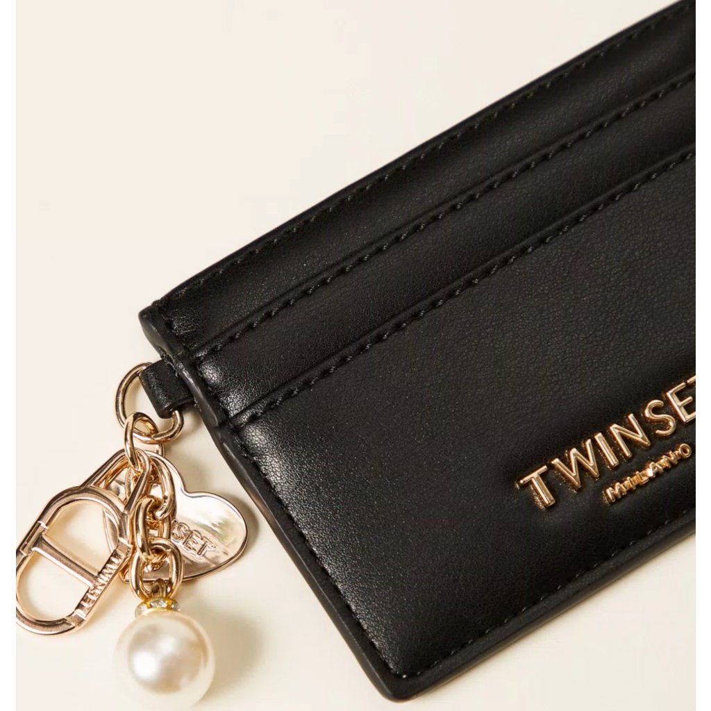 Černá mini peněženka Twinset s přihrádkami na karty, kapsou na zip a ozdobným přívěskem s perlou. Elegantní a praktický doplněk.