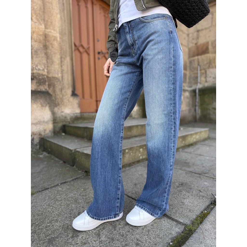 Model má klasické pětikapsové provedení, zapínání na zip a knoflík a poutka v pase pro doplnění opasku. Typickým prvkem je jemně sepraný (washed) efekt, který dodává džínům lehce vintage vzhled.