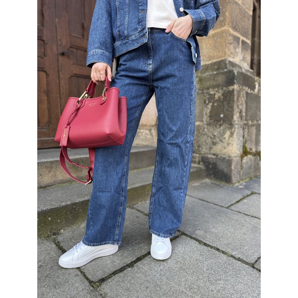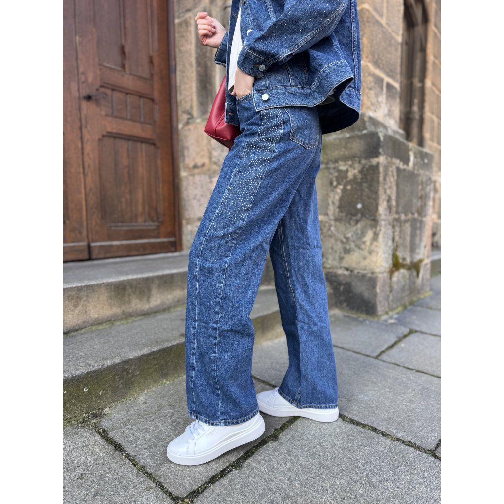 Kalhoty jsou navrženy v rovnějším, lehce uvolněném střihu nohavic, který působí moderně a snadno se kombinuje s teniskami i elegantnější obuví. Výrazným prvkem je dekorativní pruh z drobných třpytivých kamínků na boční části nohavic, který dodává kalhotám originální a elegantní charakter. Tento detail vytváří zajímavý kontrast s klasickým modrým denimem a dodává modelu lehce glam styl.