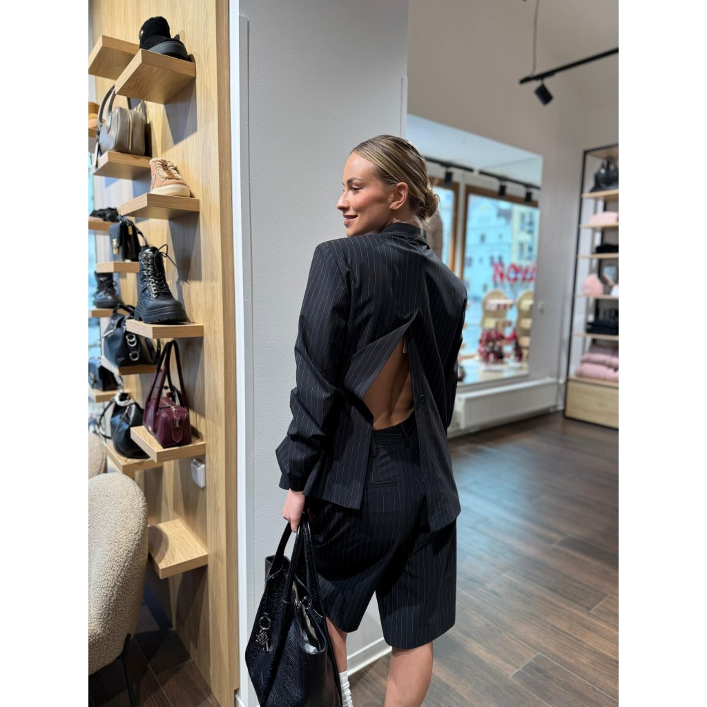 Elegantní proužkované sako s otevřenými zády a minimalistickým zapínáním. Unikátní design, moderní střih a kvalitní zpracování.