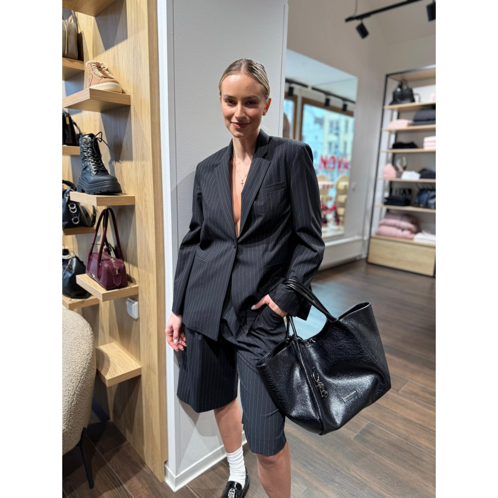 Sako je ušito z kvalitního materiálu s jemným svislým proužkem, který opticky prodlužuje postavu. Díky volnějšímu střihu poskytuje vysoký komfort a skvěle funguje jako samostatný statement kousek i jako součást kompletu se šortkami ve stejném provedení.