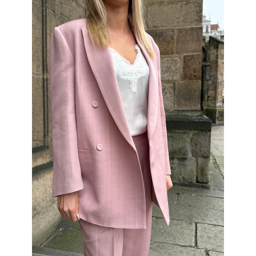 Elegantní dámské růžové sako s dvojitým zapínáním a jemnou strukturou látky. Nadčasový střih vhodný pro pracovní i společenské stylingy.
