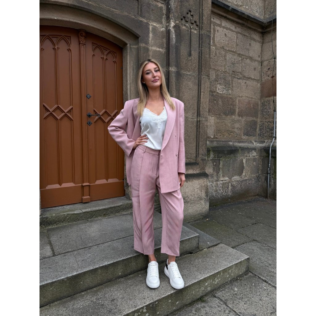 Materiál je lehký, příjemný a vizuálně působí luxusním dojmem. Jemně růžový odstín skvěle funguje v business dress codu, ale také při volnějším smart-casual stylingu. Lze ho kombinovat s kalhotami do kompletu, s denimem nebo šaty. Vhodné pro celoroční použití.