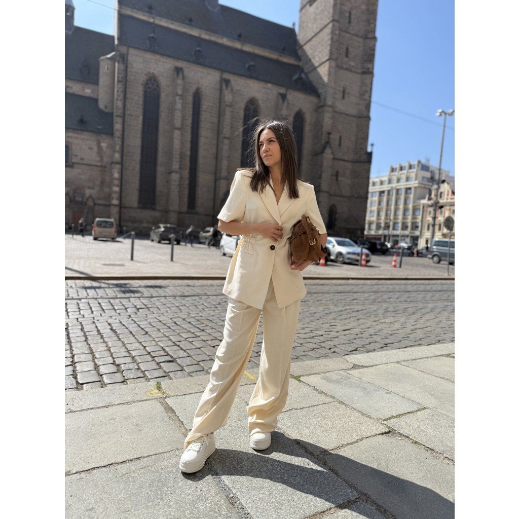 Krémové provedení působí velmi sofistikovaně a nadčasově. Ideální volba pro letní pracovní outfit i elegantní volnočasový styling – skvěle ladí s kalhotami, sukní i šortkami ze stejné kolekce.