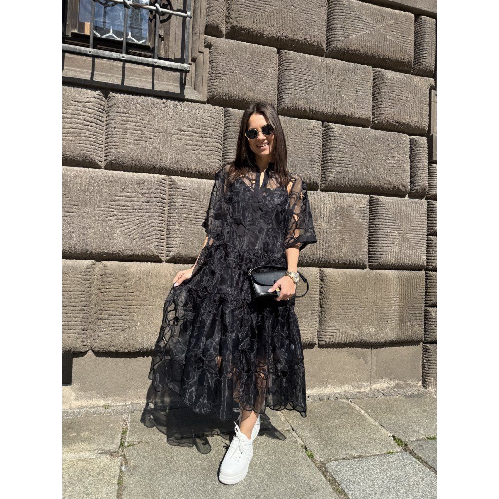 Dámské šaty Meimeij M6EW01 100 v černé barvě. Elegantní a vzdušný model s minimalistickým designem pro moderní ženský outfit.