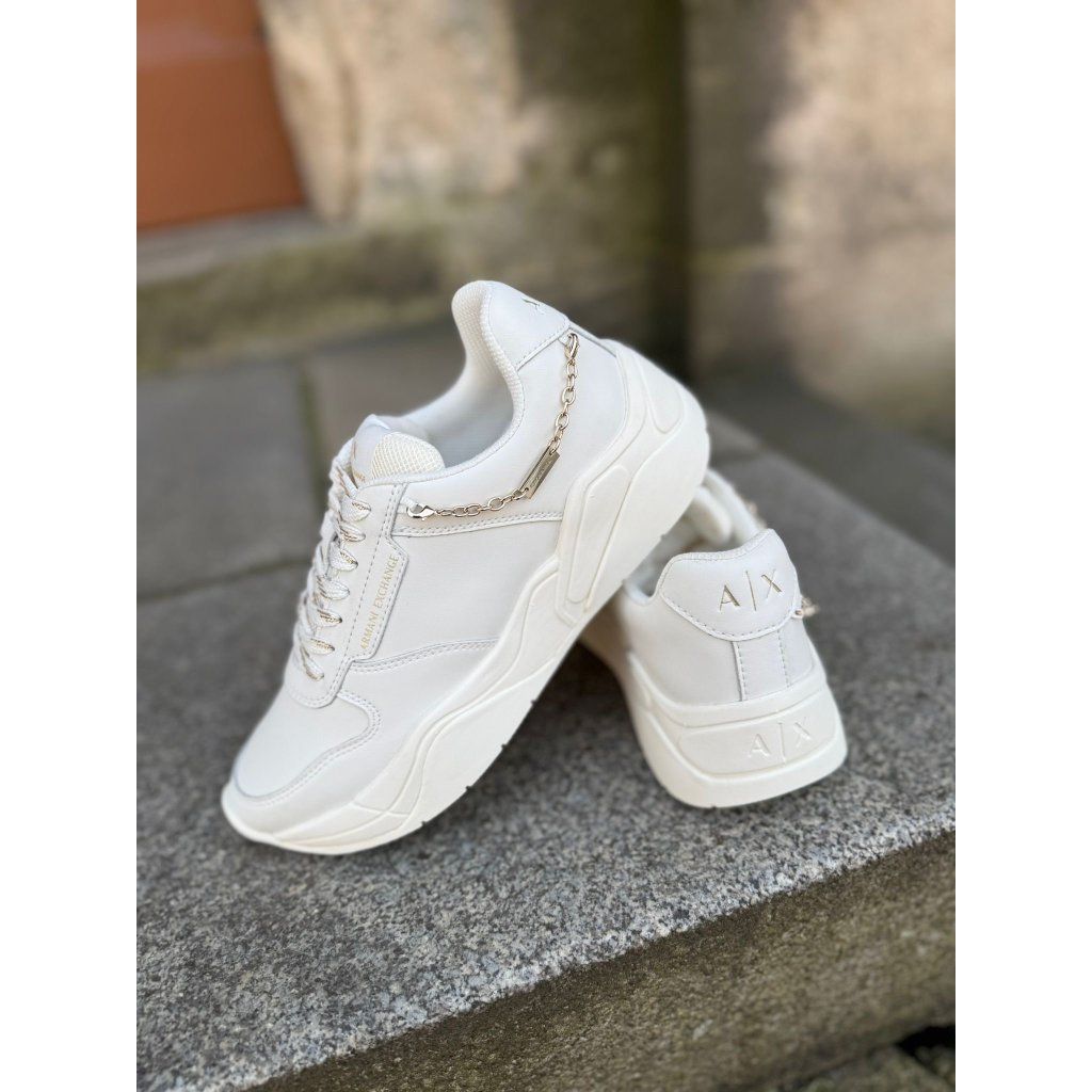 Dámské bílé tenisky Armani Exchange v moderním minimalistickém designu. Stylový model s logem značky a ozdobným řetízkem na patě skvěle doplní každodenní městský outfit.