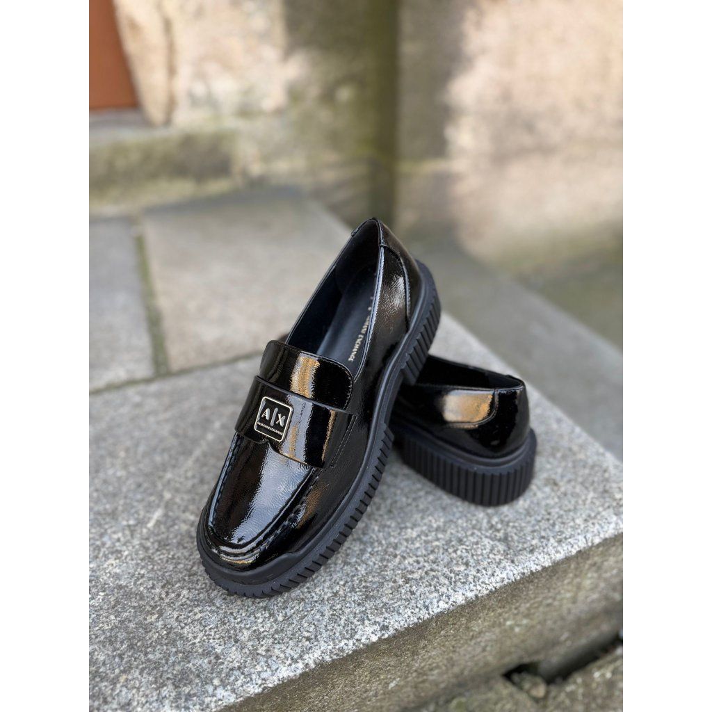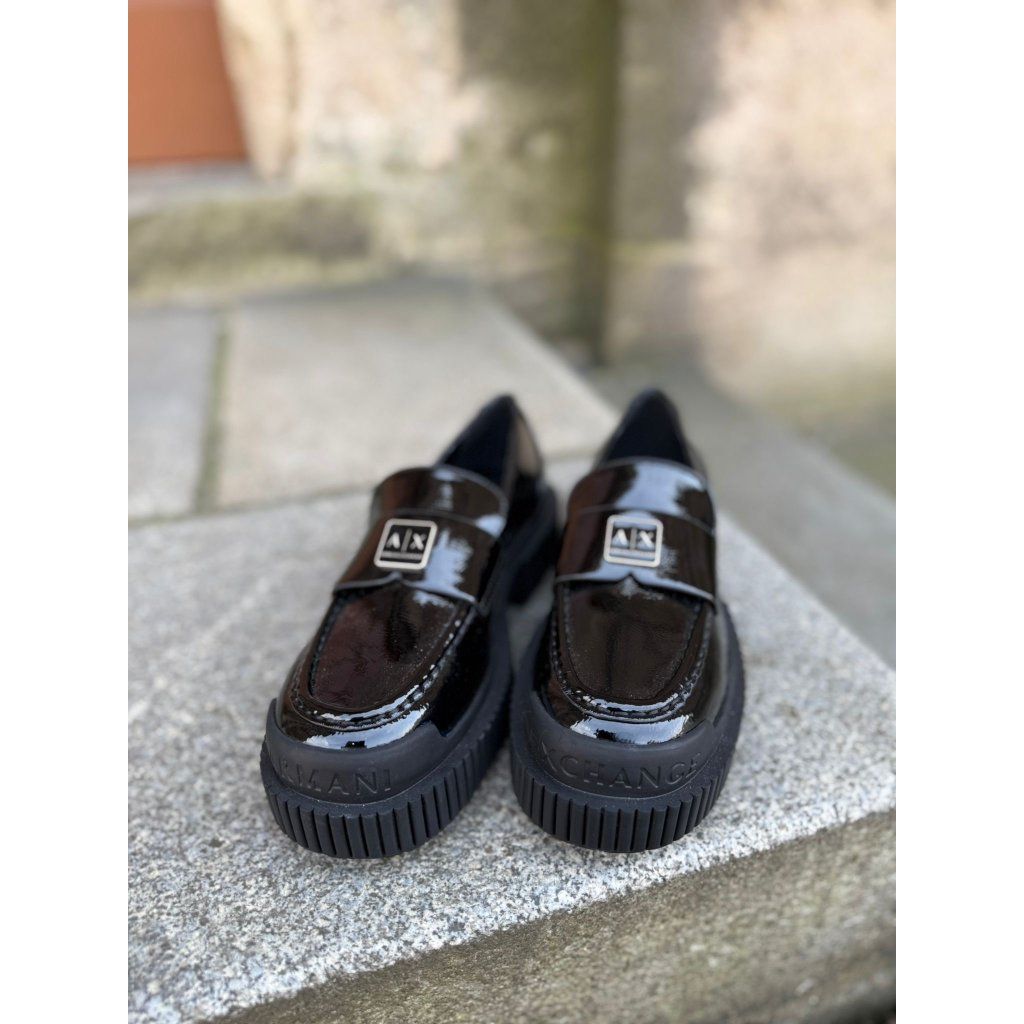 Dámské lakované mokasíny Armani Exchange v černém provedení s kovovým logem A|X. Elegantní a moderní model na výrazné podrážce, ideální pro stylový městský outfit.