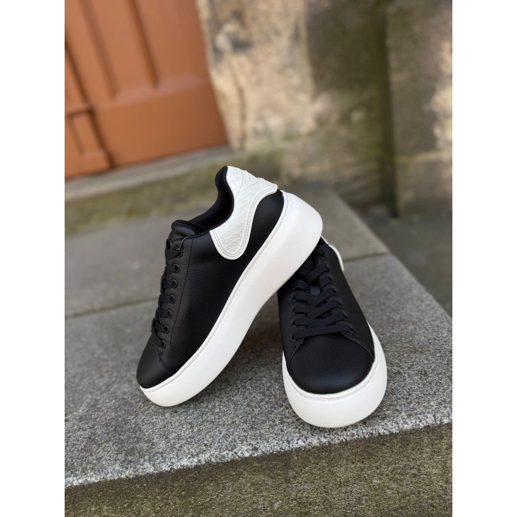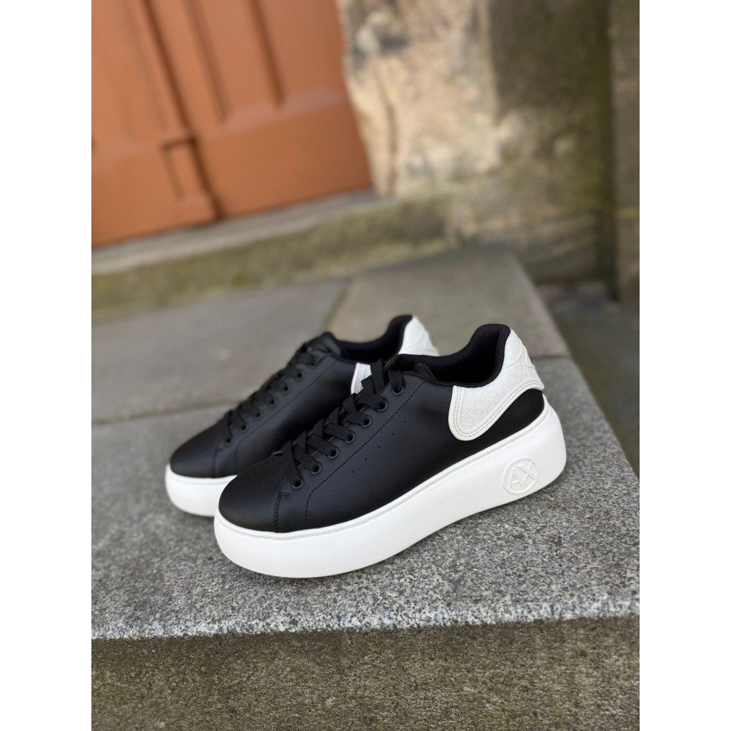Dámské černé tenisky Armani Exchange s kontrastním bílým detailem na patě a logem A|X. Moderní a pohodlný model ideální pro každodenní městský outfit.