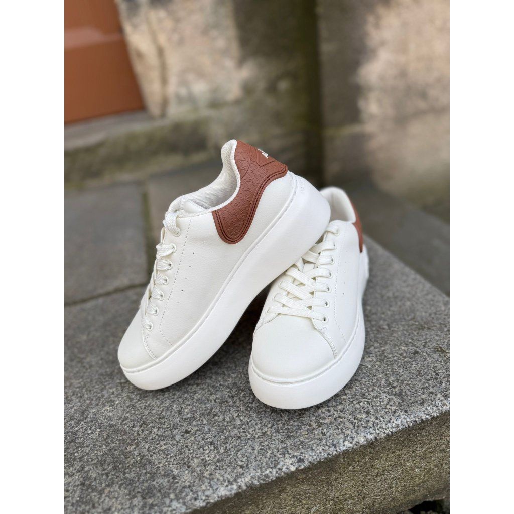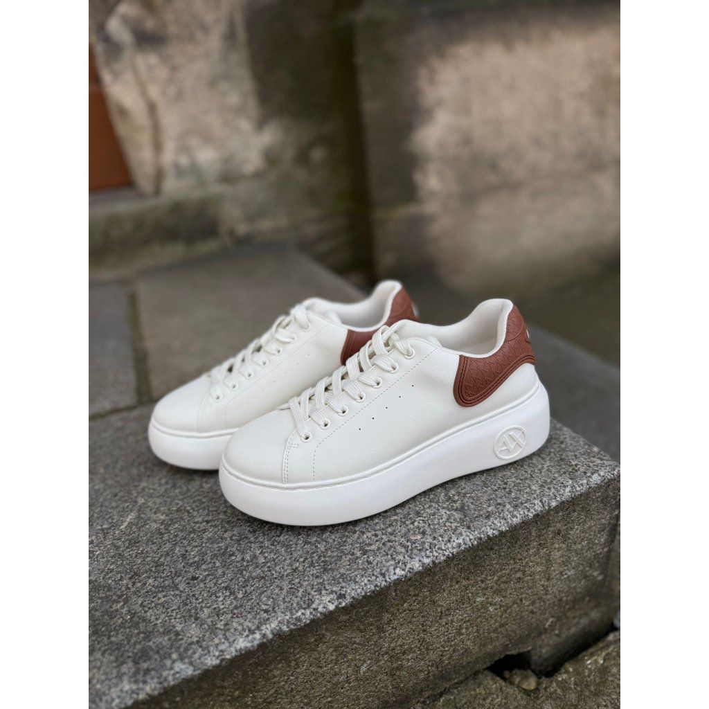 Dámské bílé tenisky Armani Exchange XW002149 AF19528 MZ279 s kontrastním hnědým detailem na patě a moderní platformovou podrážkou. Stylový a pohodlný model pro každodenní nošení.