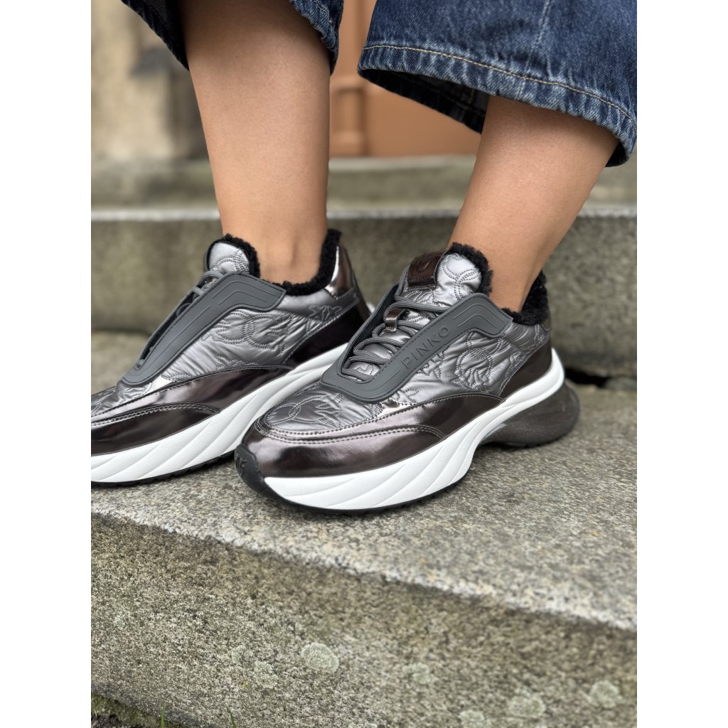 Dámské tenisky od značky Pinko z modelové řady Ariel 19 v elegantní šedé barvě. Tento model kombinuje moderní design s pohodlím — svrchní část obsahuje prošívaný vzor a logový detail, materiálový mix zahrnuje kůži, polyester a polyuretan pro stylový vzhled. Vnitřní podšívka je navržena pro komfort, podrážka je z gumy a nabízí stabilní běhací profil.