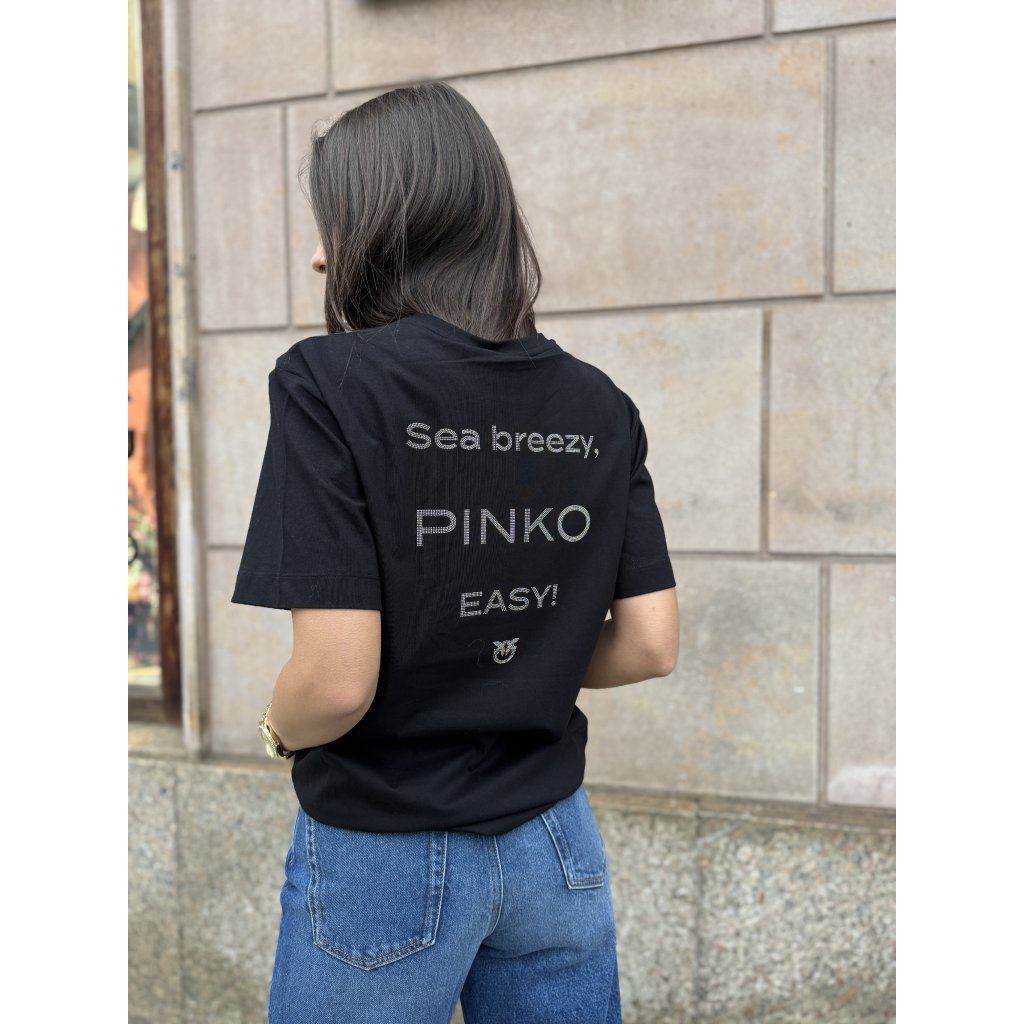 Černé tričko Pinko STREPITOSO z kvalitní bavlny s potiskem „Sea breezy, PINKO EASY!“ – pohodlný a stylový kousek pro každý den.