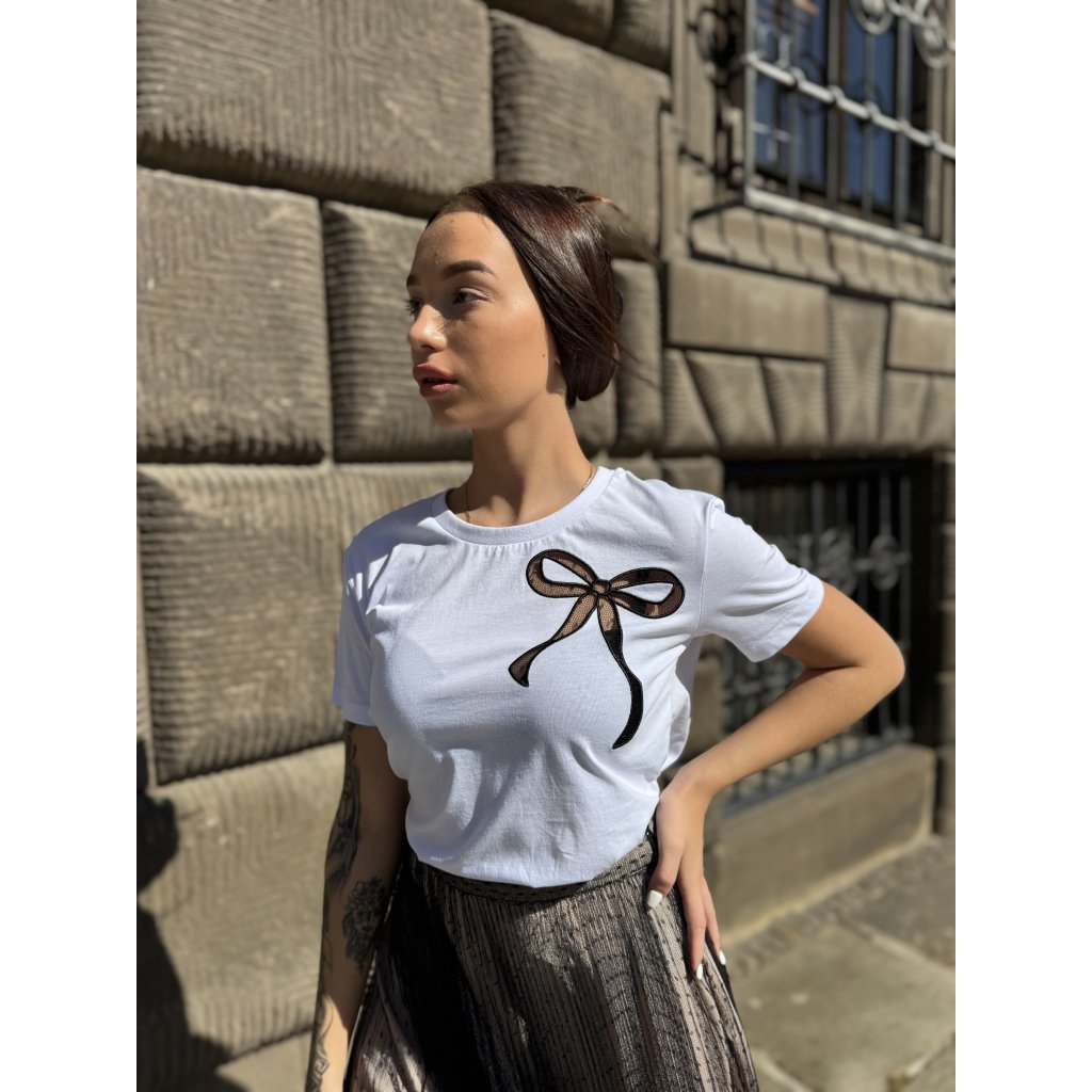 Bílé tričko Twinset z bavlny s elegantní krajkovou mašlí na přední straně – ženský a stylový kousek pro každou příležitost.