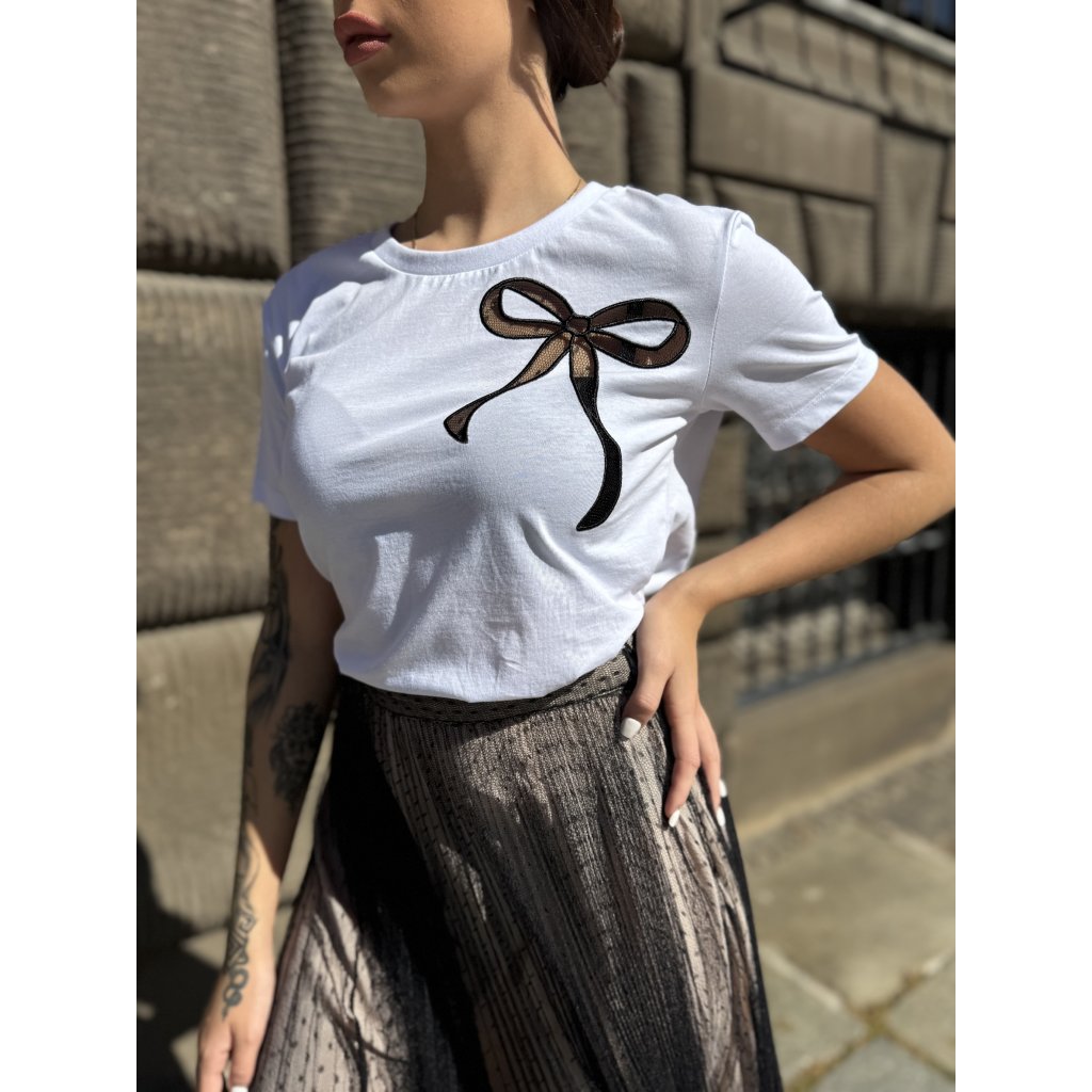 Bílé tričko Twinset z bavlny s elegantní krajkovou mašlí na přední straně – ženský a stylový kousek pro každou příležitost.