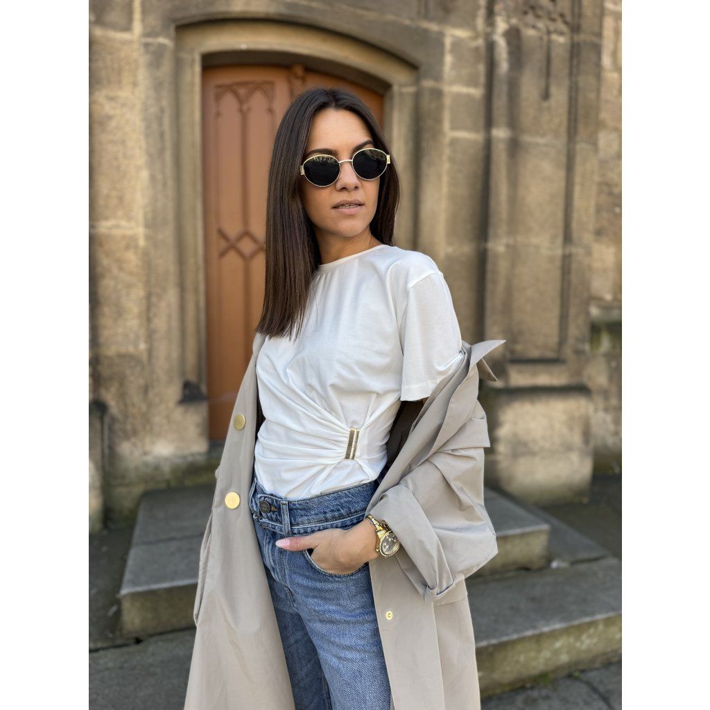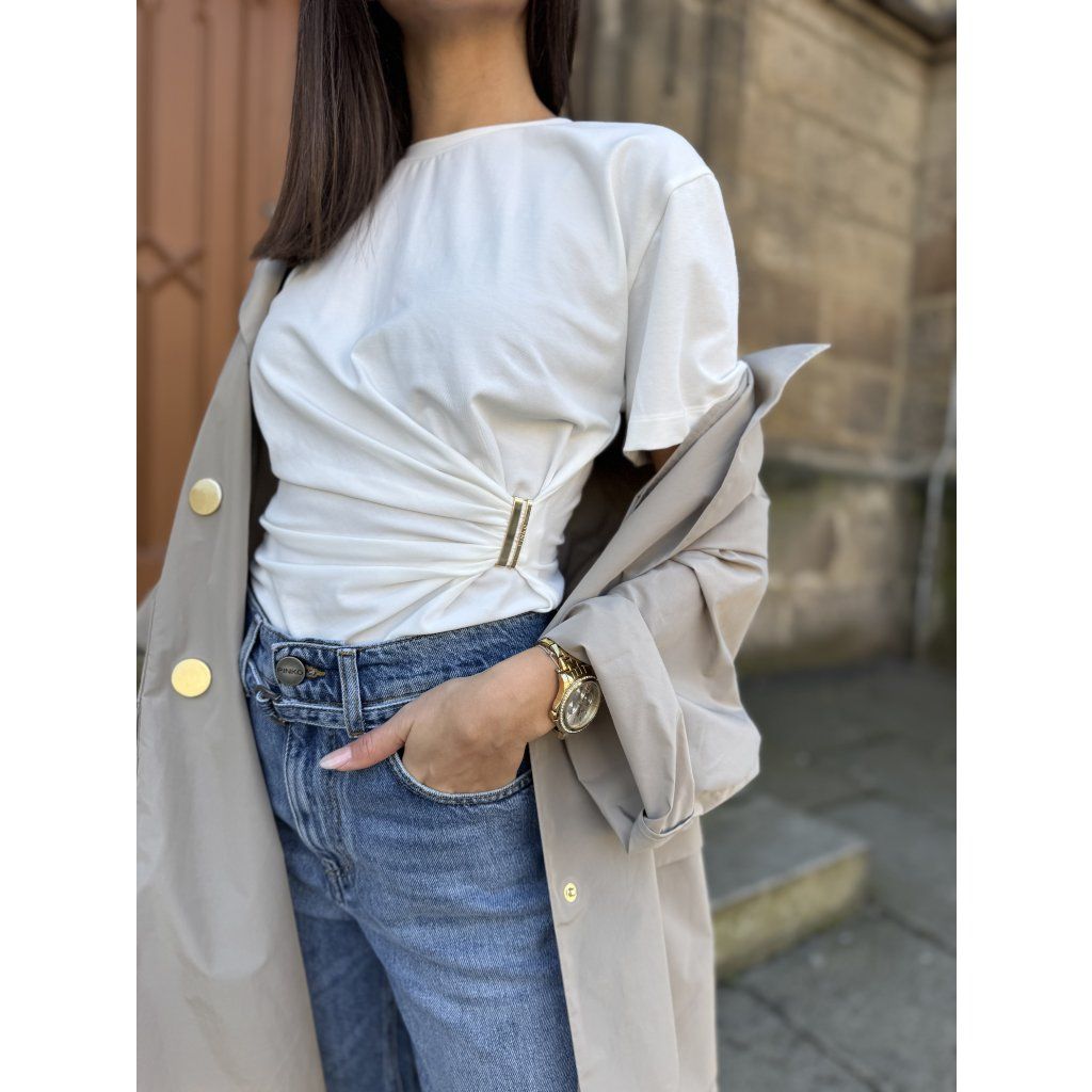 Dámské bílé triko Pinko MARY s elegantním řasením v pase a kovovým detailem, stylový a nadčasový kousek pro každodenní outfit.