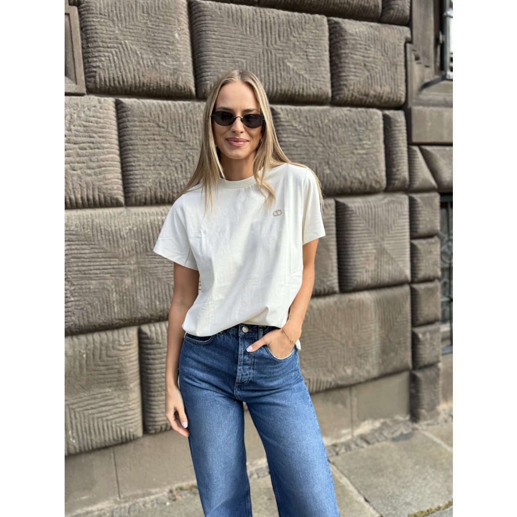 Krémové tričko Twinset ze 100 % bavlny s kamínkovým logem – komfortní a stylový základ pro elegantní i volnočasové outfity.