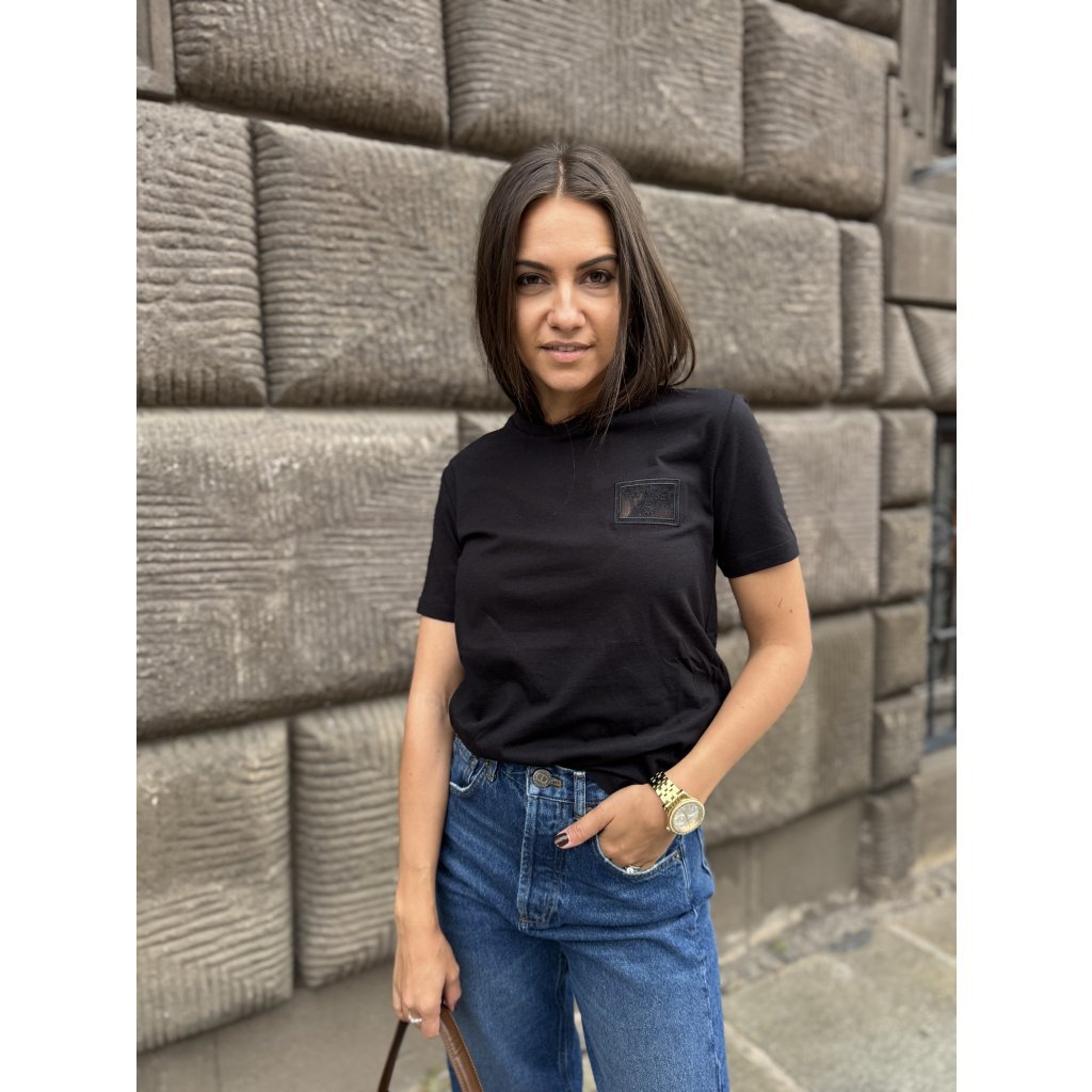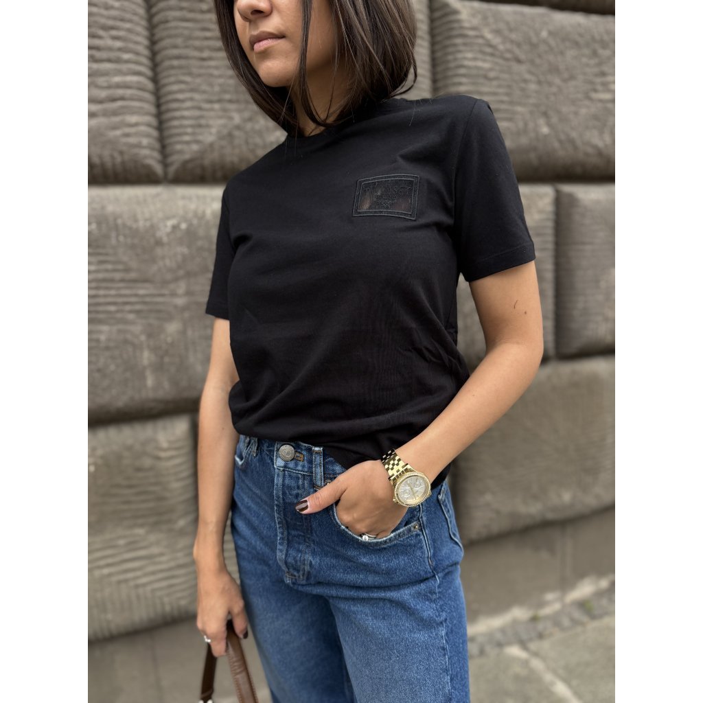 Elegantní dámské tričko značky Twinset v klasické černé barvě je dokonale ženským kouskem, který kombinuje jednoduchost a jemný romantický detail. Vyrobeno z měkké bavlny s příměsí elastanu, která je příjemná na dotek, prodyšná a zaručuje pohodlí při nošení. Tričko má klasický střih (regular fit) s kulatým výstřihem a krátkými rukávy, které doplňuje jemná krajková aplikace s logem Twinset na prsu. Tento detail dodává jinak minimalistickému kousku elegantní a ženský vzhled.