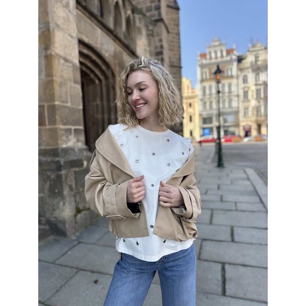 Dámské triko Twinset v bílém provedení představuje stylový kousek, který v sobě spojuje jednoduchý střih a výrazné dekorativní detaily. Klasický střih s kulatým výstřihem a krátkými rukávy zajišťuje pohodlné nošení a nadčasový vzhled. Dominantním prvkem jsou kovové průchodky a drobné aplikace po celé přední části, které dodávají tričku moderní a lehce extravagantní charakter.