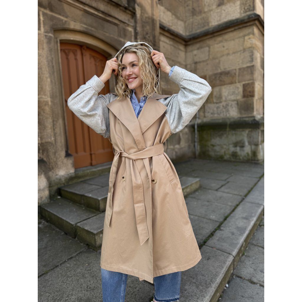 Dámský kabát Twinset 261LL2JBB 13300 je stylový trench coat vyrobený z kvalitní bavlněné gabardény, která je pevná, prodyšná a ideální pro přechodné období. Kombinuje klasický trench design s moderními prvky, jako jsou odnímatelné rukávy z mikinového materiálu a kapuce, díky čemuž lze kabát variabilně přizpůsobit stylu i počasí.