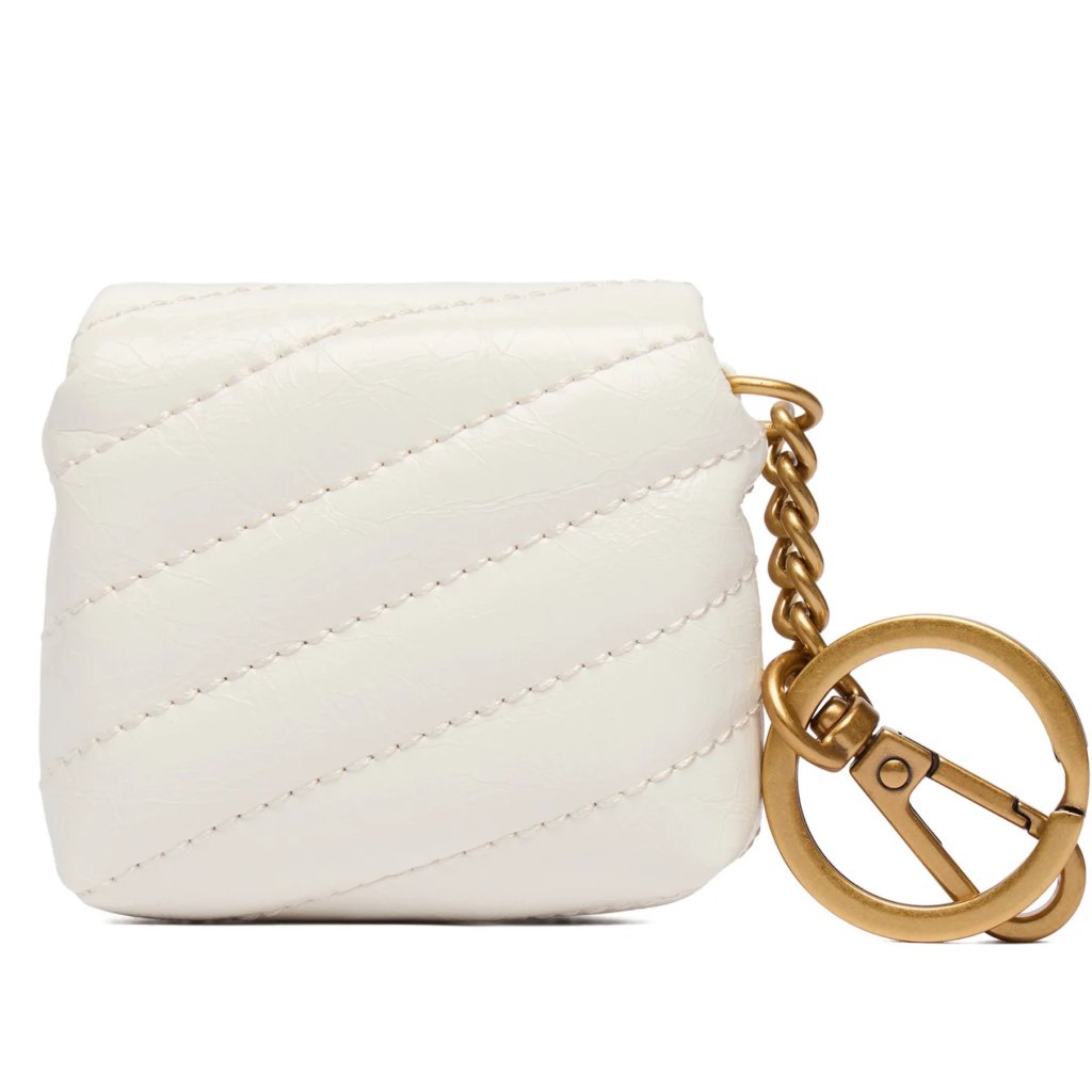 Luxusní přívěsek na AirPods Pinko Love Puff je stylovým doplňkem, který kombinuje praktičnost s ikonickým designem značky Pinko. Vyrobený z lesklé mikrovláknové kůže (Shiny Calf) v elegantní bílé barvě, zaujme prošívaným vzhledem a kovovým logem Love Birds na přední straně. Díky pevnému zapínání a kovovému kroužku jej snadno připnete na kabelku, batoh nebo klíče. Ideální volba pro ochranu AirPods i jako módní detail vašeho outfitu.