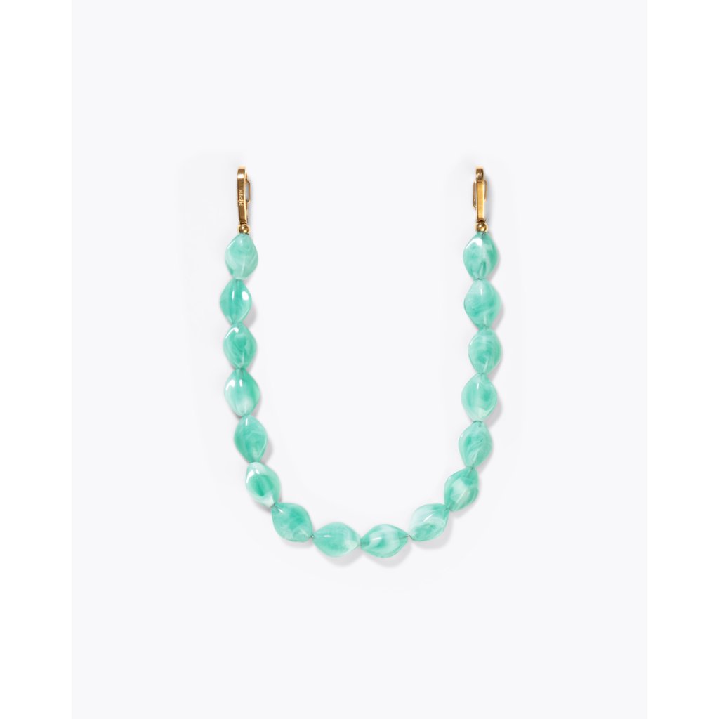 Krátká šňůrka Atelje v jemném zeleném odstínu zaujme originálním provedením z lesklých korálků s decentním mramorovým efektem. Elegantní kovové karabiny ve zlatém tónu umožňují snadné připnutí ke kabelce, telefonu nebo pouzdru a zároveň dodávají doplňku stylový akcent. Ideální jako praktický i módní detail pro každodenní nošení.