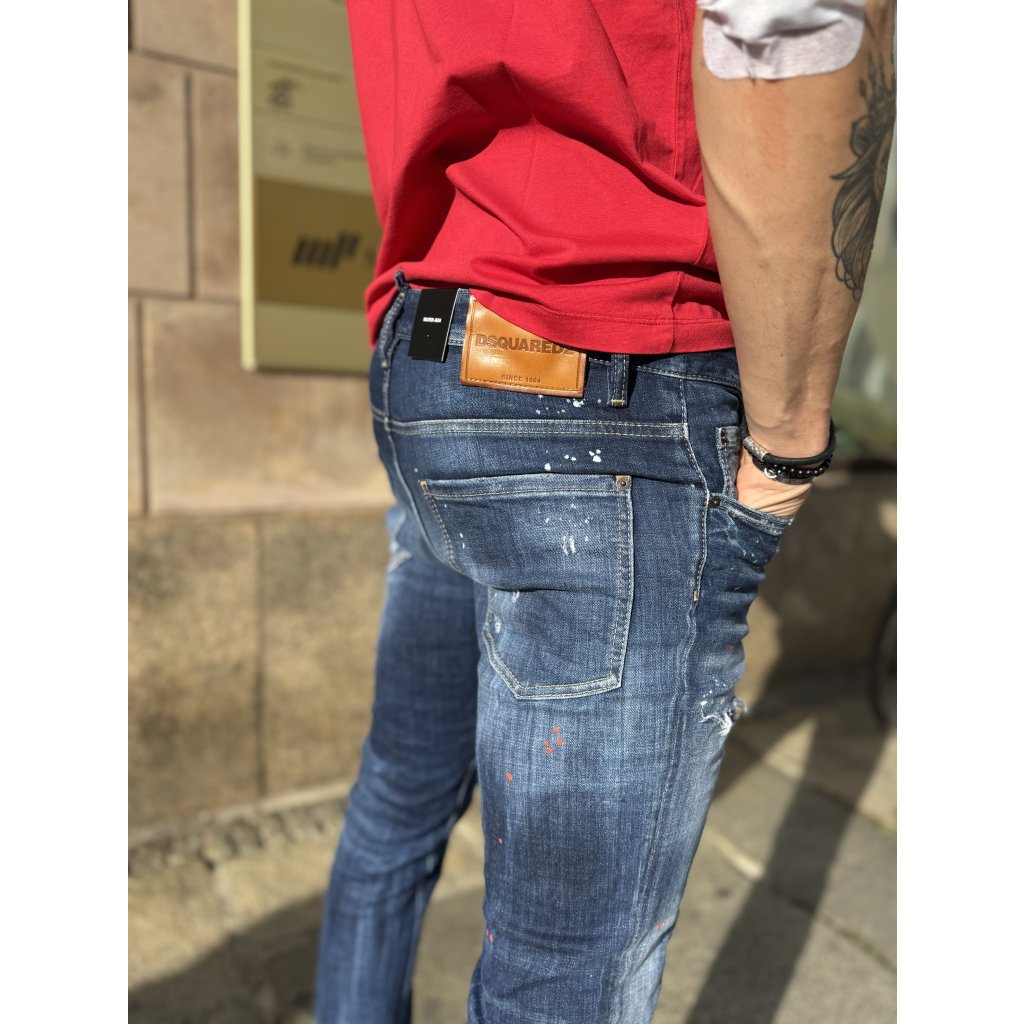 Pánské džíny DSQUARED2 Skater (S74LB1734 S30664) – modrý slim fit denim s typickým opotřebovaným efektem a logem značky.