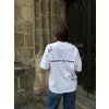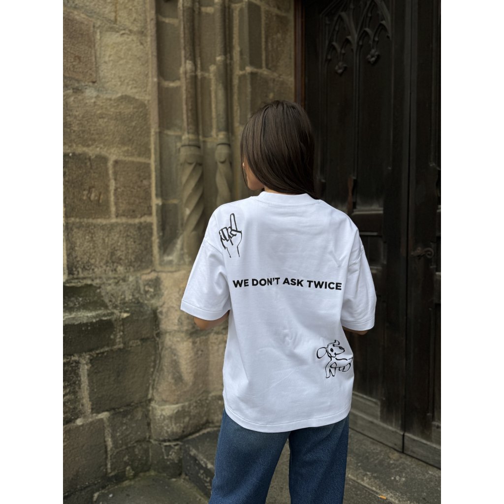 Na zádech je originální potisk s nápisem „WE DON’T ASK TWICE“, doplněný o jemné liniové ilustrace – ruční gesto a ikonického pejska, které dávají tričku osobitý charakter.