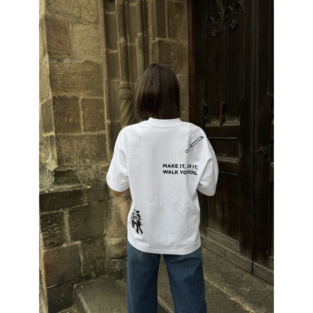 Na zadní straně dominuje nápis „MAKE IT, SIGN IT, WALK YOUR DOG.“, doplněný o jednoduché liniové ilustrace – tužku a výrazného psa, které dávají tričku osobitý charakter a umělecký nádech.