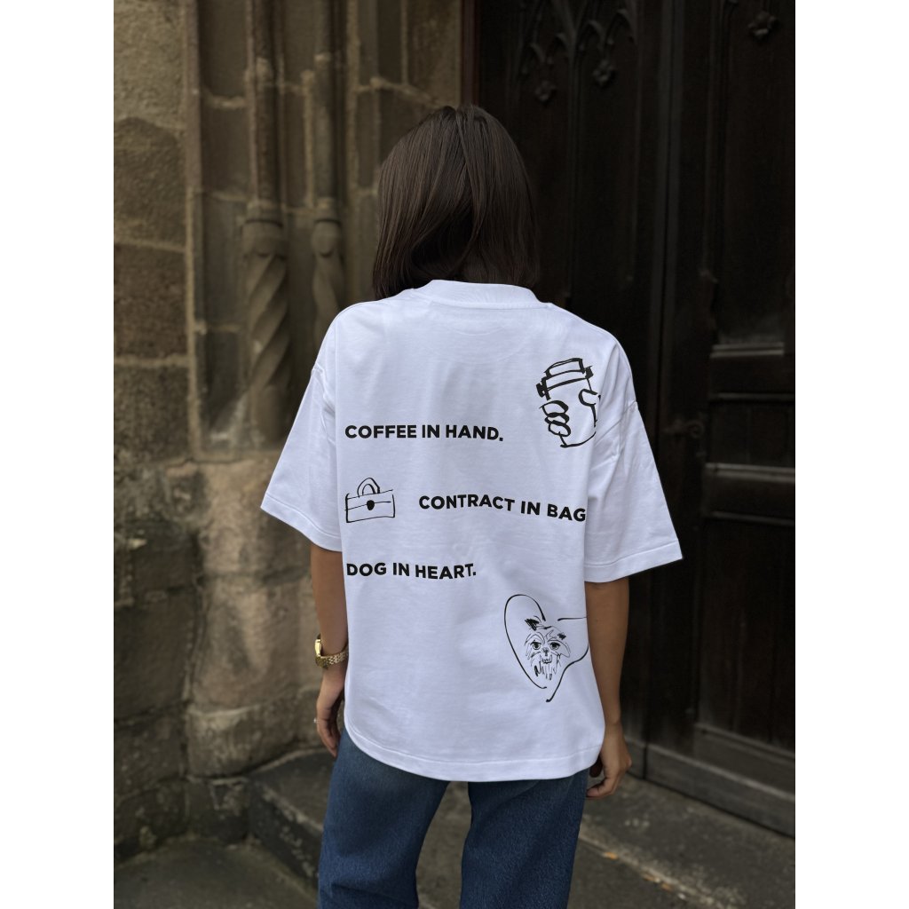 Na zadní straně dominuje nápis „COFFEE IN HAND. CONTRACT IN BAG. DOG IN HEART.“, doplněný o jednoduché liniové ilustrace – kelímek, kabelka a pejsek v srdíčku, které dávají tričku osobitý charakter a umělecký nádech.