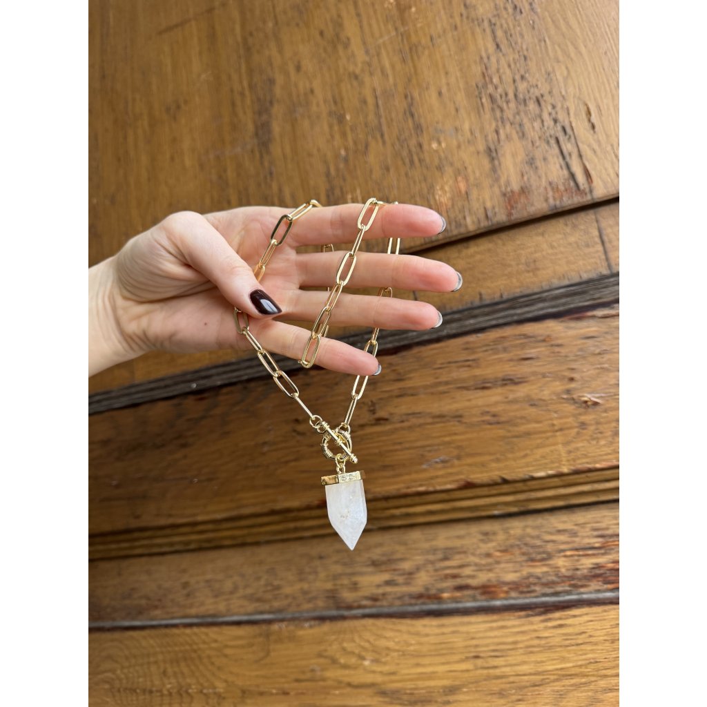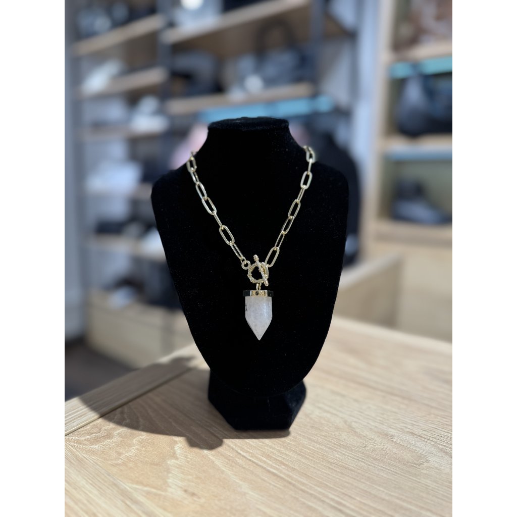 Stylový náhrdelník na jemném řetízku ve zlatém tónu je elegantním doplňkem pro každodenní i slavnostní příležitosti. Výrazný přívěsek s přírodně působícím kamínkem dodává šperku osobitý charakter a moderní vzhled. Díky minimalistickému provedení se náhrdelník snadno kombinuje s dalšími doplňky i různými styly oblečení a stává se univerzálním kouskem každého šatníku. Jedná se o bižuterii.